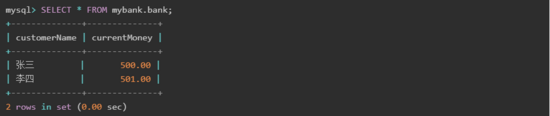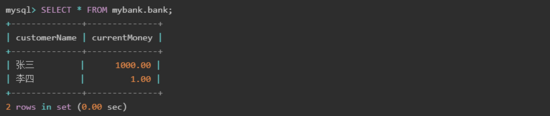 從結(jié)果可以看出,執(zhí)行事務(wù)回滾后,賬戶數(shù)據(jù)恢復(fù)到初始狀態(tài),即該事務(wù)執(zhí)行之前的狀態(tài)。