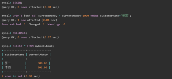 將張三的賬戶余額減少 1000 元,并讓事務(wù)回滾,SQL 語句和運行結(jié)果如下所示: