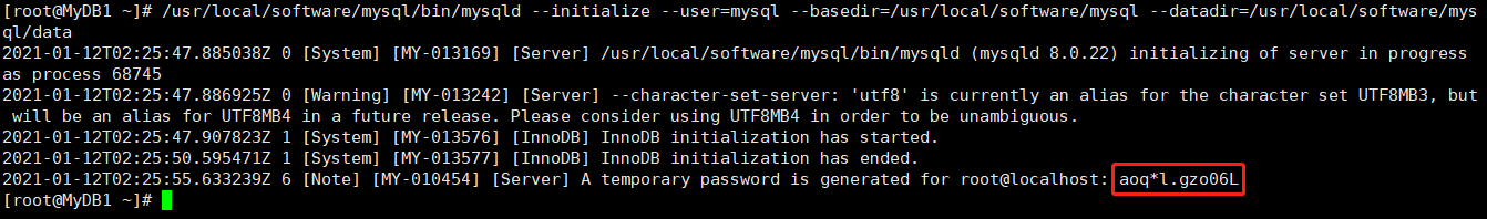 [root@MyDB1 ~]# /usr/local/software/mysql/bin/mysqld --initialize --user=mysql --basedir=/usr/local/software/mysql --datadir=/usr/local/software/mysql/data