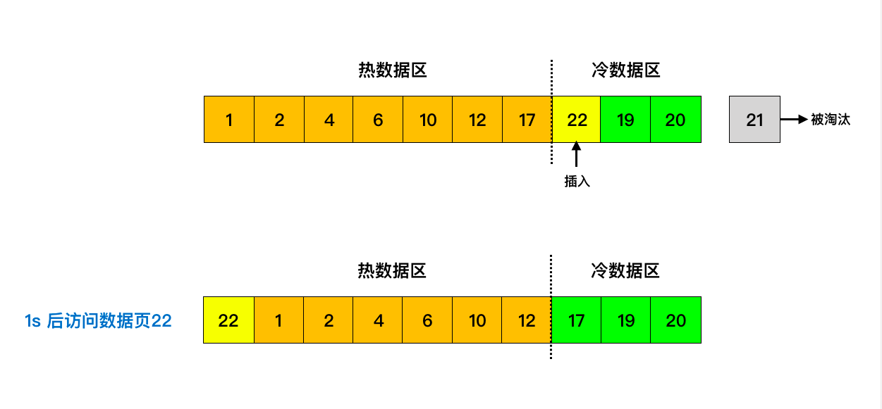 當(dāng)數(shù)據(jù)頁第一次被加載到緩沖池中的時候,先將其放到冷數(shù)據(jù)區(qū)域的鏈表頭部,1s(由 innodb_old_blocks_time 參數(shù)控制)后該緩存頁被訪問了再將其移至熱數(shù)據(jù)區(qū)域的鏈表頭部。