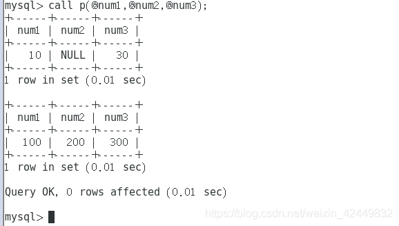 mysql> create database yy; Query OK, 1 row affected (0.00 sec) mysql> use yy; Database changed mysql> set @num1=10,@num2=20,@num3=30; //設(shè)置全局變量 mysql> delimiter $$ mysql> create procedure p(in num1 int,out num2 int,inout num3 int) -> begin -> select num1,num2,num3; -> set num1=100,num2=200,num3=300; -> select num1,num2,num3; -> end $$ Query OK, 0 rows affected (0.00 sec) mysql> delimiter ; mysql> call p(@num1,@num2,@num3);