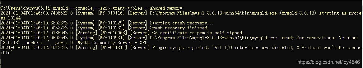 C:\Users\xxx>mysqld --console --skip-grant-tables --shared-memory