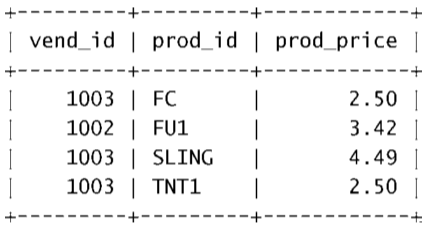 SELECT vend_id, prod_id, prod_price FROM products WHERE vend_id IN (1001, 1002);