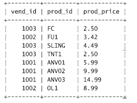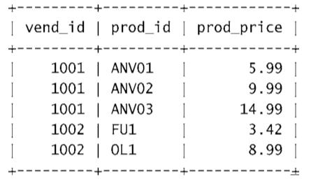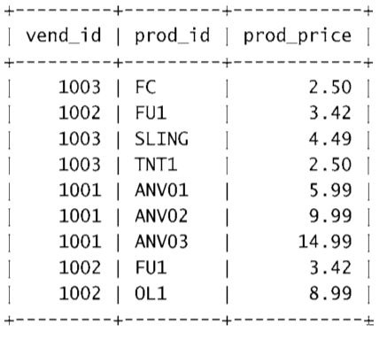 SELECT vend_id, prod_id, prod_price FROM products WHERE prod_price <= 5 UNION ALL SELECT vend_id, prod_id, prod_price FROM products WHERE vend_id IN (1001, 1002);