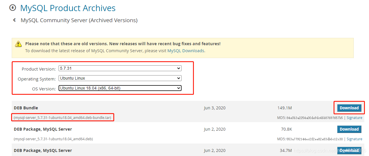 # 在服務(wù)器里直接獲取(服務(wù)器需要聯(lián)網(wǎng)) wget https://dev.mysql.com/get/Downloads/MySQL-5.7/mysql-server_5.7.31-1ubuntu18.04_amd64.deb-bundle.tar # 也可以直接將網(wǎng)址粘貼到瀏覽器下載安裝壓縮包 https://dev.mysql.com/get/Downloads/MySQL-5.7/mysql-server_5.7.31-1ubuntu18.04_amd64.deb-bundle.tar