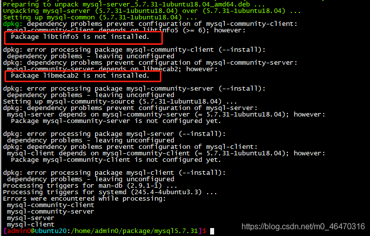 報(bào)錯(cuò)的意思是缺少 2個(gè)包 libtinfo5 和 libmecab2,那就安裝這兩個(gè)包,如果還缺少其他包,按照下面的步驟安裝即可。