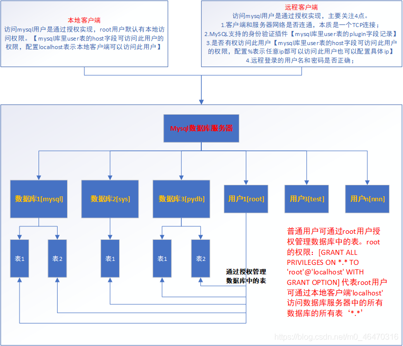 # 查看用戶test0的權(quán)限 show grants for test0@localhost; 顯示:[GRANT USAGE ON *.* TO 'test0'@'localhost'] USAGE: 表示無(wú)權(quán)限用戶。 # 用test0用戶登錄pydb數(shù)據(jù)庫(kù) mysql -utest0 -ptest0111 pydb 報(bào)錯(cuò)提示無(wú)權(quán)操作:[ERROR 1044 (42000): Access denied for user 'test0'@'localhost' to database 'pydb'] # 使用root用戶給test0用戶賦權(quán) grant all privileges on '數(shù)據(jù)庫(kù)名'.'表名' to '用戶名'@'IP地址' identified by "密碼" with grant option; # 例如設(shè)置本地客戶端訪問(wèn)此用戶: mysql> grant all privileges on pydb.* to 'test0'@'localhost' identified by 'test0111' with grant option; # 設(shè)置遠(yuǎn)程任意客戶端訪問(wèn)此用戶: mysql> grant all privileges on pydb.* to 'test0'@'%' with grant option; # 刷新權(quán)限 mysql> flush privileges; # 查看本地權(quán)限 show grants for 'test0'@'localhost'; 回顯:[GRANT ALL PRIVILEGES ON `pydb`.* TO 'test0'@'localhost' WITH GRANT OPTION] # 查看遠(yuǎn)程權(quán)限 show grants for 'test0'@'%'; 回顯:[GRANT ALL PRIVILEGES ON `pydb`.* TO 'test0'@'%' WITH GRANT OPTION] 權(quán)限都添加成功了,現(xiàn)在本地客戶端和遠(yuǎn)程客戶端都擁有了登陸test0用戶操作pydb數(shù)據(jù)庫(kù)下的所有表的權(quán)限了。 # 賦權(quán)命令解釋 grant: 賦權(quán)關(guān)鍵字 all privileges: 賦權(quán)類型,all privileges表示所有權(quán)限。也可以賦值具體的權(quán)限如:select、update、create、drop等。 on: 表示權(quán)限要賦給哪個(gè)數(shù)據(jù)庫(kù)的哪個(gè)表,*.* 表示所有數(shù)據(jù)庫(kù)的所有表。 to: 表示權(quán)限要賦給哪個(gè)用戶,格式:”用戶名”@”登錄IP或域名”。localhost表示本機(jī)客戶端可登錄此用戶, %表示任何主機(jī)客戶端都可以登錄此用戶,如果配的是具體ip例如'用戶名'@'192.168.113',表示只允許192.168.113這個(gè)主機(jī)客戶端登錄此用戶。 也可以配置IP段例如'用戶名'@'192.168.%' identified by: 設(shè)置此用戶的登錄密碼,也可以不設(shè)置。 with grant option: 表示允許此用戶將自己的權(quán)限授權(quán)給其它用戶。 注意: grant添加的權(quán)限是自動(dòng)疊加的,比如第一次添加了select權(quán)限后面再添加insert權(quán)限,那么此用戶就擁有select和insert權(quán)限。如果此用戶已經(jīng)擁有所有權(quán)限,再添加select權(quán)限則此用戶還是擁有all privileges所有權(quán)限。 # 移除權(quán)限 revoke insert on '數(shù)據(jù)庫(kù)名'.'表名' from '用戶名'@'IP地址'; # 例如移除insert權(quán)限: revoke insert on pydb.* from 'test0'@'localhost'; # 例如所有權(quán)限: revoke all on pydb.* from 'test0'@'localhost'; # 刷新權(quán)限 mysql> flush privileges;