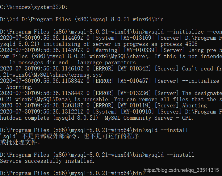 執(zhí)行下面的命令:mysqld --install 進行安裝