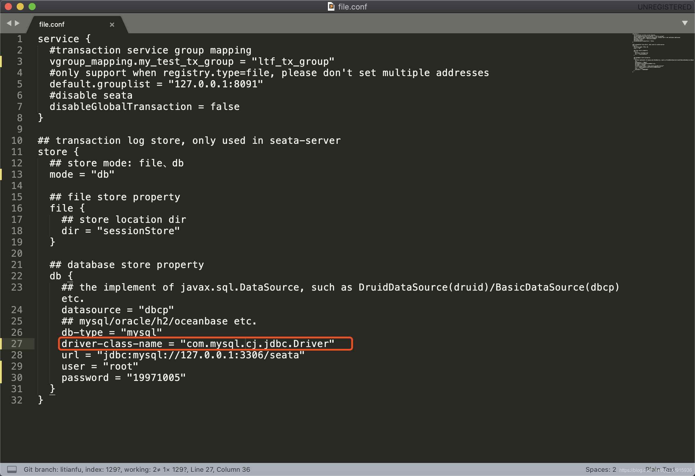 2.修改seata/conf/file.conf,driver-class-name = "com.mysql.cj.jdbc.Driver"