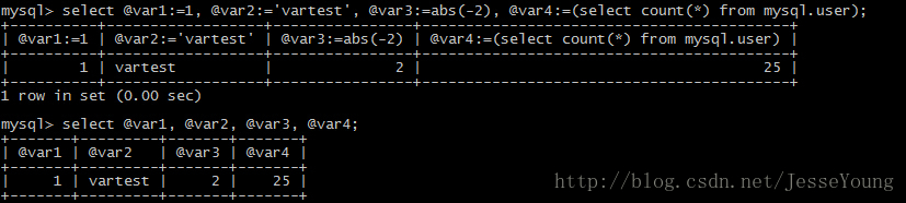 mysql> select @var1:=1, @var2:='vartest', @var3:=abs(-2), @var4:=(select count(*) from mysql.user); +----------+------------------+----------------+------------------------------------------+ | @var1:=1 | @var2:='vartest' | @var3:=abs(-2) | @var4:=(select count(*) from mysql.user) | +----------+------------------+----------------+------------------------------------------+ | 1 | vartest | 2 | 25 | +----------+------------------+----------------+------------------------------------------+ mysql> select @var1, @var2, @var3, @var4; +-------+---------+-------+-------+ | @var1 | @var2 | @var3 | @var4 | +-------+---------+-------+-------+ | 1 | vartest | 2 | 25 | +-------+---------+-------+-------+ +-------+---------+-------+-------+ | 1 | vartest | 2 | 25 | +-------+---------+-------+-------+