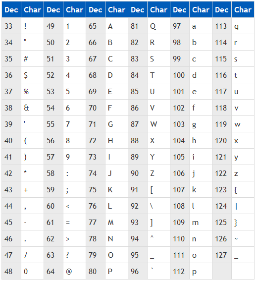 這個(gè)字符集使用1個(gè)字節(jié)進(jìn)行編碼,一個(gè)字節(jié)具有8位,總共可以保存128個(gè)字符,具體的對(duì)應(yīng)關(guān)系如下:
