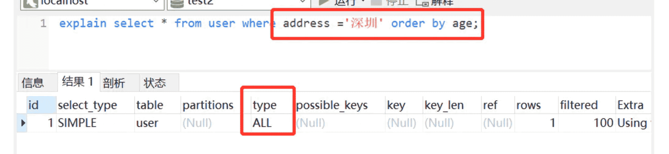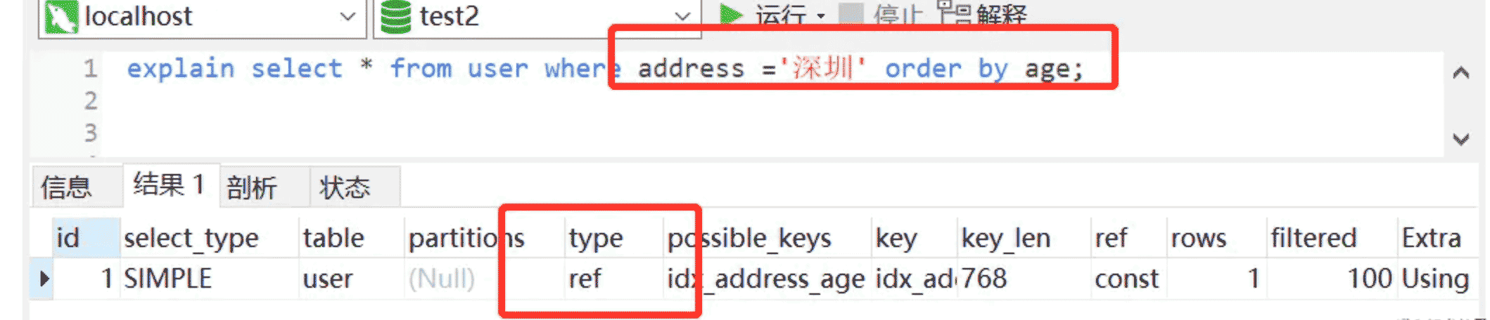 -- 添加索引alter table user add index idx_address_age (address,age)