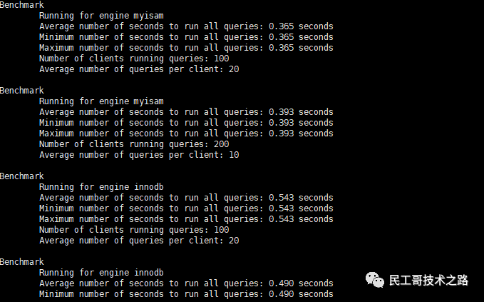 [root@mysql~]#mysqlslap--defaults-file=/etc/my.cnf--concurrency=100,200--iterations=1--number-int-cols=20--number-char-cols=30 --auto-generate-sql--auto-generate-sql-add-autoincrement--auto-generate-sql-load-type=mixed--engine=myisam,innodb--number-of-queries=2000-uroot-p123--verbose