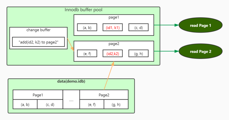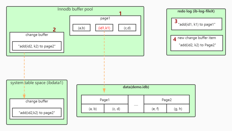- Page 2 沒(méi)有在內(nèi)存中,就在內(nèi)存的 change buffer 區(qū)域,記錄下“我要往 Page 2 插入一行”