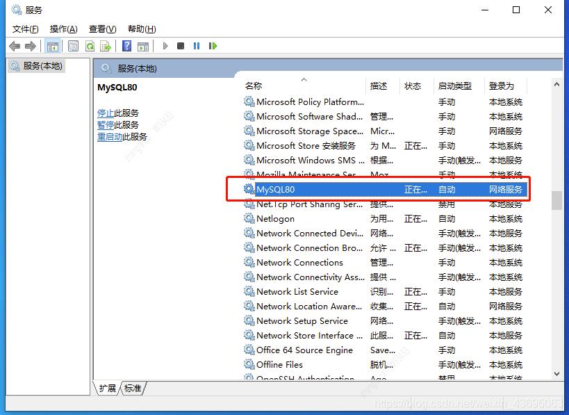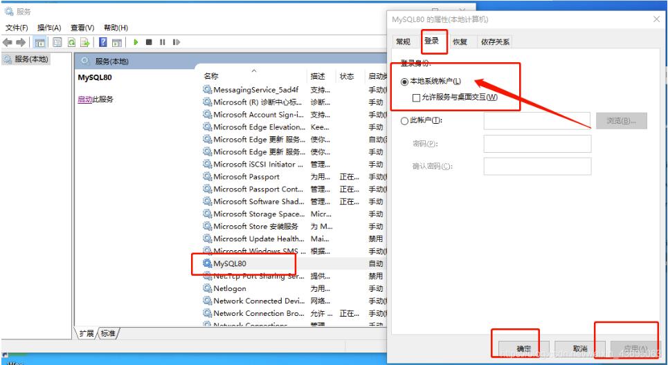 win+r打開運行,輸入services.msc打開服務(wù),找到安裝MySQL時添加的服務(wù)名,一般8.0版本的MySQL默認是MySQL80,雙擊打開,登錄選項卡下將選擇的此賬戶改為選擇本地系統(tǒng)賬戶