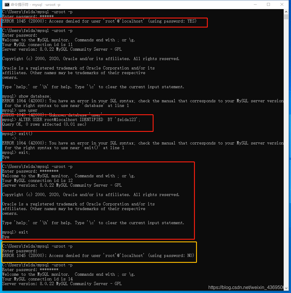 不輸入密碼,直接點回車登錄,然后修改密碼,修改密碼語句:ALTER USER root@localhost IDENTIFIED BY ‘123456'; 修改密碼為:123456 ,修改后,就只能用密碼登錄了