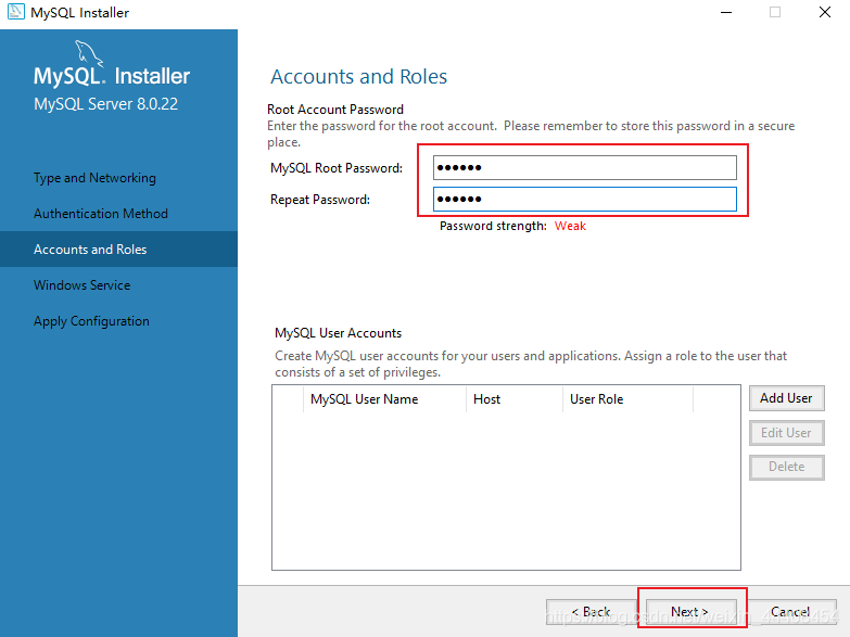 14. 設(shè)置‘Root'賬戶密碼,然后點(diǎn)擊'Next'