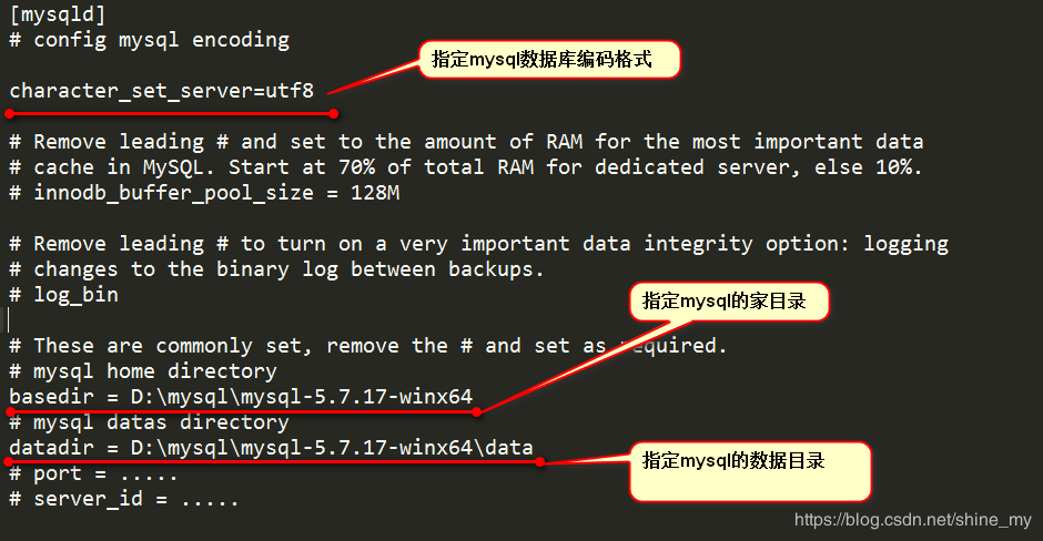 1. 解壓下載的mysql的安裝包,將解壓目錄下的my-default.ini文件拷貝到同目錄下,重命名為my.ini文件,然后修改文件內(nèi)容,如下: