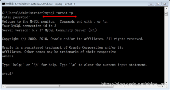 重啟dos命令行,輸入命令: mysql –uroot –p