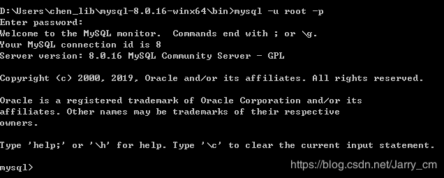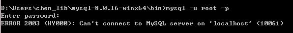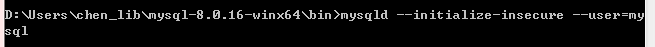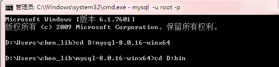 進入到D:\Users\chen_lib\mysql-8.0.16-winx64\bin目錄下,這里再cd時,D:后面不能加斜杠,否則報錯
