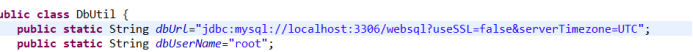public static String dbUrl="jdbc:mysql://localhost:3306/websql?useSSL=false&serverTimezone=UTC";