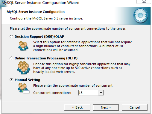 選擇mysql允許的最大連接數(shù),第一種是最大20個(gè)連接并發(fā)數(shù),第二種是最大500個(gè)并發(fā)連接數(shù),最后一種是自定義,你可以根據(jù)自己的需要選擇
