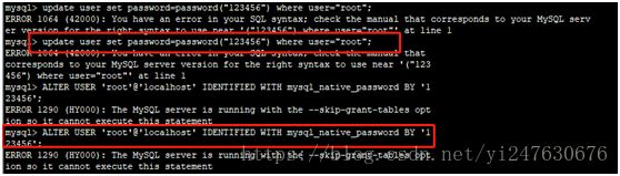 mysql> flush privileges; Query OK, 0 rows affected (0.00 sec) mysql> alter user 'root'@'localhost'IDENTIFIED BY 'MyNewPass'; ERROR 1819 (HY000): Your password does notsatisfy the current policy requirements mysql> alter user 'root'@'localhost'IDENTIFIED BY 'MyNewPass@123'; ERROR 1396 (HY000): Operation ALTER USERfailed for 'root'@'localhost' mysql> alter user'root'@'%' IDENTIFIED BY 'MyNewPass@123';
