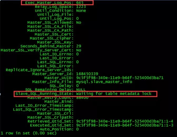 1.DDL未開始,被阻塞,這時SHOW SLAVE STATUS的結果能檢查到Slave_SQL_Running_State為waiting for table metadata lock,且Exec_Master_Log_Pos不變;