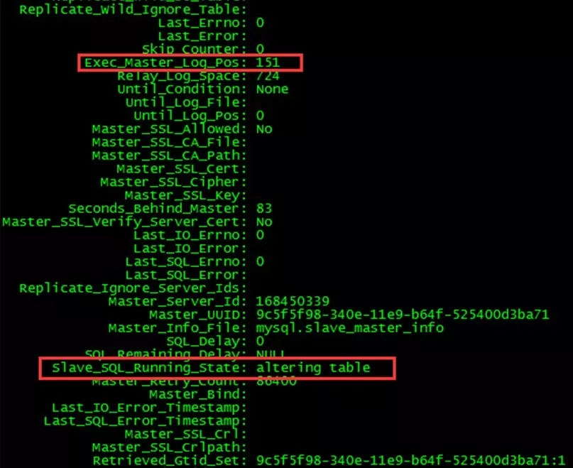 從現(xiàn)象上,如果從庫執(zhí)行SHOW SLAVE STATUS的輸出中,檢查Exec_Master_Log_Pos一直未動,在排除主庫執(zhí)行大事務的情況下,那么就有可能是在執(zhí)行大表的 DDL。這一點結合分析主庫binlog,看主庫當前執(zhí)行的事務就可以進行確認。