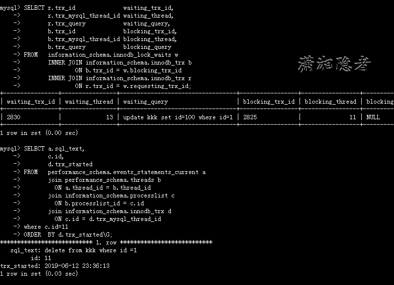 mysql> SELECT r.trx_id waiting_trx_id, -> r.trx_mysql_thread_id waiting_thread, -> r.trx_query waiting_query, -> b.trx_id blocking_trx_id, -> b.trx_mysql_thread_id blocking_thread, -> b.trx_query blocking_query -> FROM information_schema.innodb_lock_waits w -> INNER JOIN information_schema.innodb_trx b -> ON b.trx_id = w.blocking_trx_id -> INNER JOIN information_schema.innodb_trx r -> ON r.trx_id = w.requesting_trx_id; +----------------+----------------+----------------------------------+-----------------+-----------------+----------------+ | waiting_trx_id | waiting_thread | waiting_query | blocking_trx_id | blocking_thread | blocking_query | +----------------+----------------+----------------------------------+-----------------+-----------------+----------------+ | 2830 | 13 | update kkk set id=100 where id=1 | 2825 | 11 | NULL | +----------------+----------------+----------------------------------+-----------------+-----------------+----------------+ 1 row in set (0.00 sec) mysql> SELECT a.sql_text, -> c.id, -> d.trx_started -> FROM performance_schema.events_statements_current a -> join performance_schema.threads b -> ON a.thread_id = b.thread_id -> join information_schema.processlist c -> ON b.processlist_id = c.id -> join information_schema.innodb_trx d -> ON c.id = d.trx_mysql_thread_id -> where c.id=11 -> ORDER BY d.trx_started\G; *************************** 1. row *************************** sql_text: delete from kkk where id =1 id: 11 trx_started: 2019-06-12 23:36:13 1 row in set (0.03 sec) ERROR: No query specified mysql>