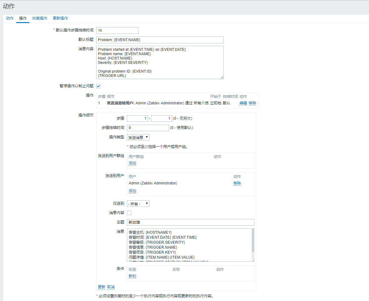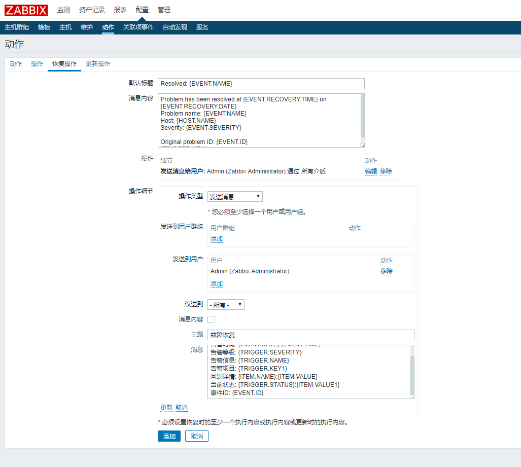 配置動作中需要執(zhí)行的動作(發(fā)送消息給管理員)