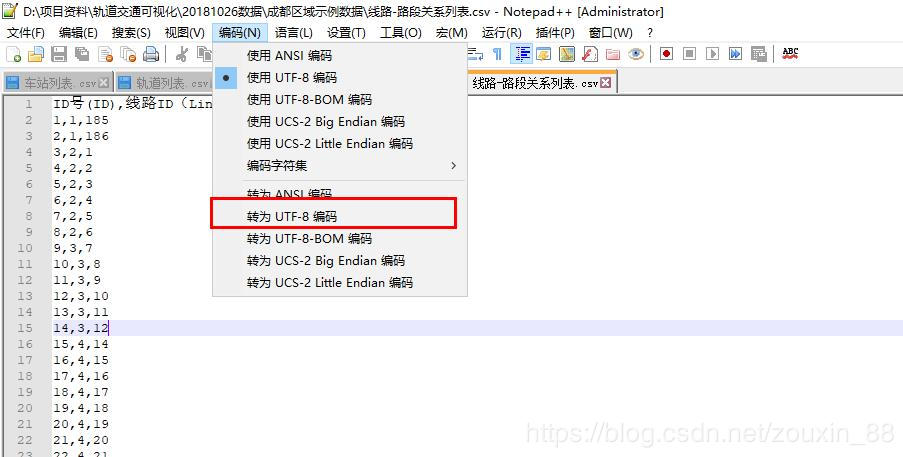 1.用Notepad++打開csv文件,點擊菜單【編碼】【轉(zhuǎn)為UTF-8編碼】,保存。