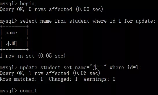 如果你不使用這2種語(yǔ)句,默認(rèn)情況下SELECT語(yǔ)句是不會(huì)加鎖的。并且對(duì)于上面提到的場(chǎng)景,必須使用排它鎖。另外,上面的2種語(yǔ)句只有在事務(wù)之中才能生效,否則不會(huì)生效。在MySQL命令行使用事務(wù)的方式如下: