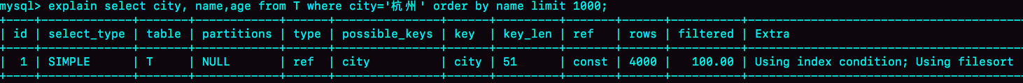 根據(jù)上面的表定義來看,city=xxx 可以使用到我們定義的一個(gè)索引。但是 order by name 明顯我們沒有索引,所以肯定需要先用索引查詢到 city=xxx 然后再進(jìn)行回表查詢,最后再排序。