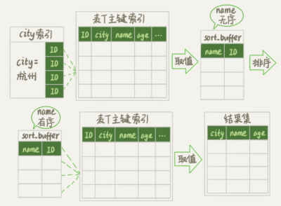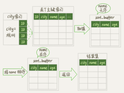 3. 回表取到 name, city, age 三個(gè)字段值,存入 sort_buffer 中。