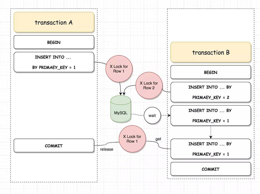 可見,如果兩個(gè)事務(wù)先后對主鍵相同的行記錄執(zhí)行 INSERT 操作,因?yàn)槭聞?wù) A 先拿到了行鎖,事務(wù) B 只能等待直到事務(wù) A 提交后行鎖被釋放。同理,如果針對唯一索引字段 address 進(jìn)行插入操作,也需要獲取行鎖,圖同主鍵插入過程類似,不再重復(fù)。