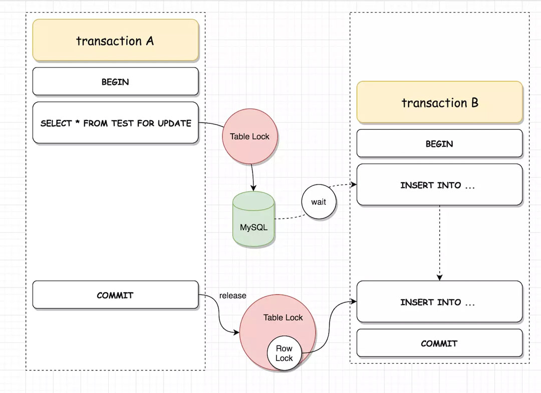 事務(wù) A SELECT FOR UPDATE 語句會(huì)拿到表 test 的 Table Lock,此時(shí)事務(wù) B 去執(zhí)行插入操作會(huì)阻塞,直到事務(wù) A 提交釋放表鎖后,事務(wù) B 才能獲取對應(yīng)的行鎖執(zhí)行插入操作。