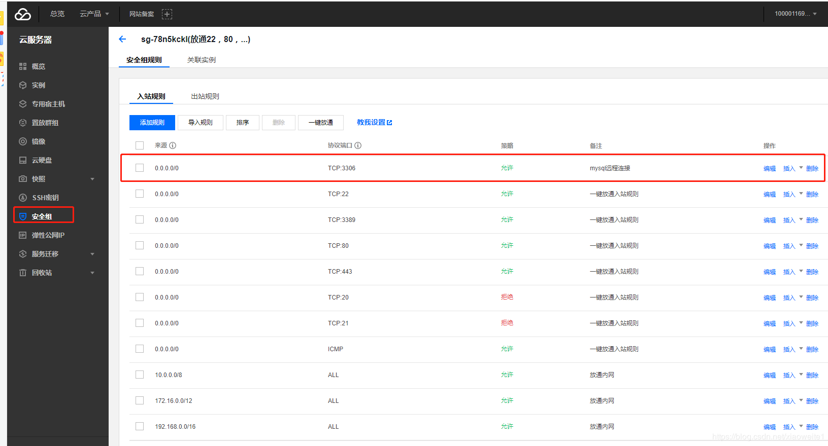 可能就是對應(yīng)的服務(wù)器限制的3306端口的訪問導(dǎo)致的,下面以騰訊云為案例: