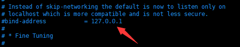 2. 在bind-address=127.0.0.1前加#注釋?zhuān)蛘咧苯觿h掉這行
