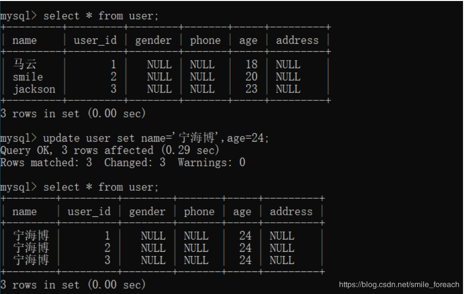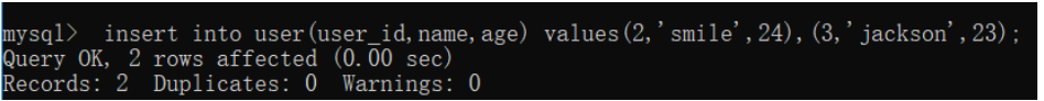 insert into user(user_id,name,age) values(1,'nice',24);