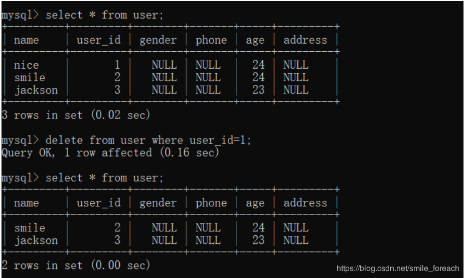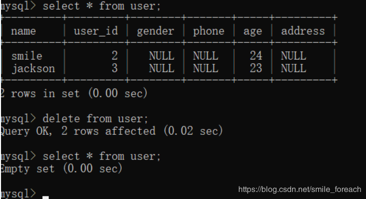 如果沒(méi)有指定條件,會(huì)將表中數(shù)據(jù)一條一條全部刪除掉。