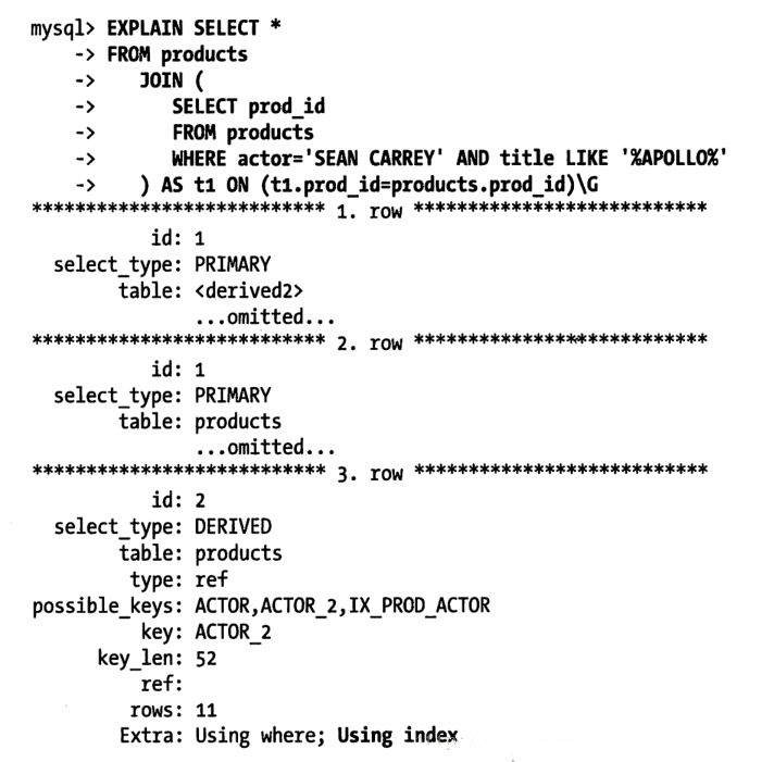 說明:在查詢的第一階段可以使用覆蓋索引,在from子句中的子查詢找到匹配的prod_id,然后根據(jù)prod_id值在外層查詢匹配獲取需要的所有值。