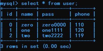 以下是正常查詢 test 庫中的 user 表內(nèi)容