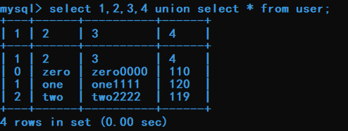 select 1,2,3,4 union select * from user;