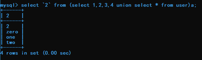 select `2` from (select 1,2,3,4 union select * from user)a;