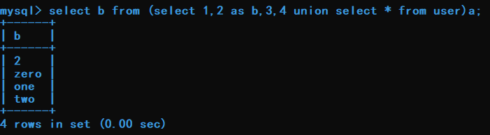 select b from (select 1,2 as b,3,4 union select * from user)a;