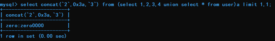 select concat(`2`,0x3a,`3`) from (select 1,2,3,4 union select * from user)a limit 1,1;