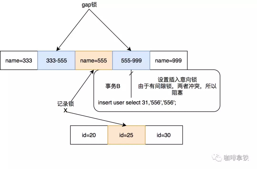 間隙鎖顧名思義鎖間隙,不鎖記錄。鎖間隙的意思就是鎖定某一個范圍,間隙鎖又叫gap鎖,其不會阻塞其他的gap鎖,但是會阻塞插入間隙鎖,這也是用來防止幻讀的關鍵。