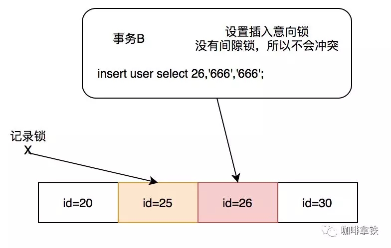 居然發(fā)現事務B并沒有發(fā)生阻塞,哎這個是咋回事呢,小明有點疑惑,按照實驗1的套路應該會被阻塞啊,因為25-30之間會有間隙鎖。于是小明又祭出了命令行,發(fā)現只加了X記錄鎖。原來是因為唯一索引會降級記錄鎖,這么做的理由是:非唯一索引加next-key鎖由于不能確定明確的行數有可能其他事務在你查詢的過程中,再次添加這個索引的數據,導致隔離性遭到破壞,也就是幻讀。唯一索引由于明確了唯一的數據行,所以不需要添加間隙鎖解決幻讀。