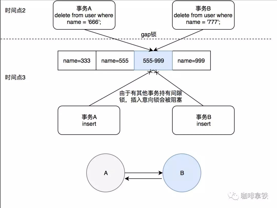 時間點2:事務A刪除name = '777'的數據,需要對777這個索引加上next-Key鎖,但是其不存在,所以只對555-999之間加間隙鎖,同理事務B也對555-999之間加間隙鎖。間隙鎖之間是兼容的。